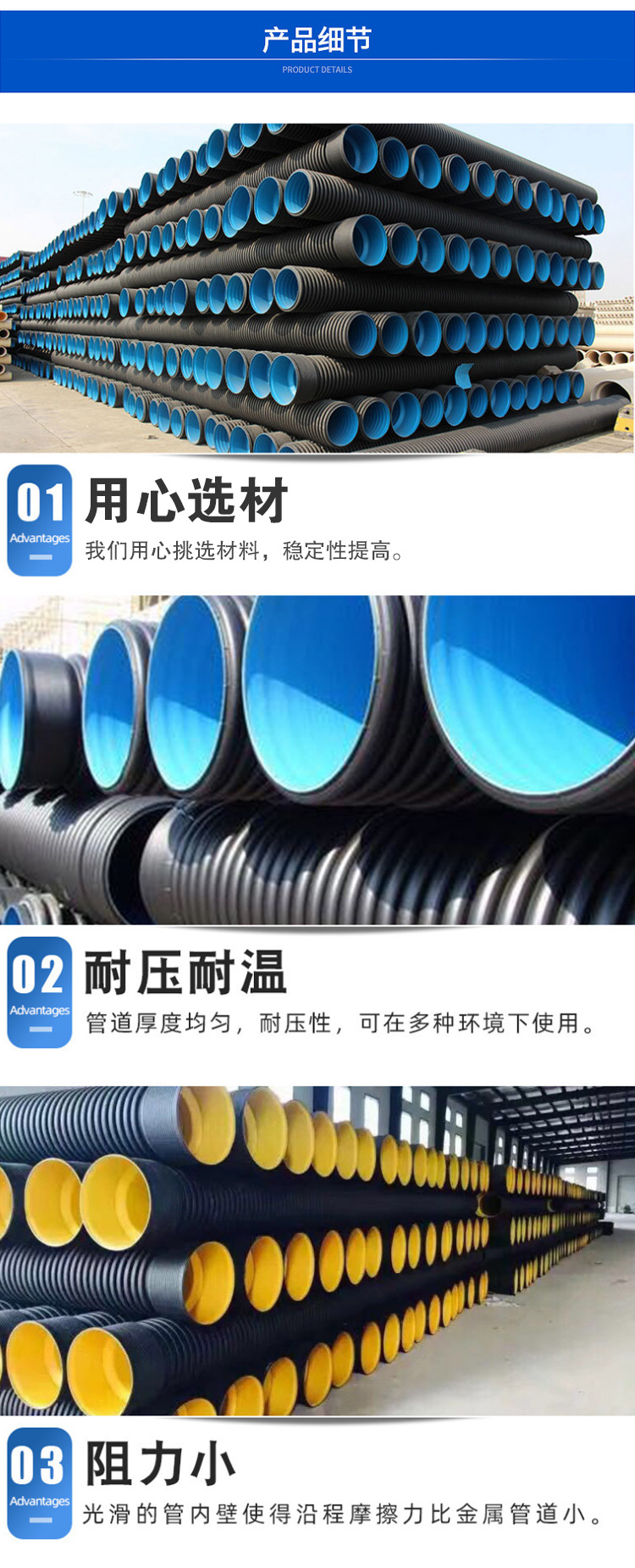 天津和瑞管业有限公司:公司主营HDPE双壁波纹管,PE给水管,克拉管,钢带增强管,钢丝网骨架管,企业一直以诚信求生存,以质量赢市场,以创新求发展,并坚持“质量第一,信誉第一”的服务宗旨,客户至上的原则,竭诚为新老客户提供优质的产品。/p>